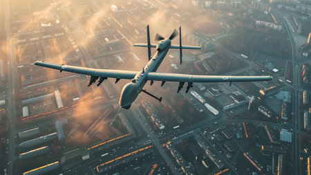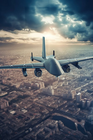Unmanned military drone patrols the territory, flying over the disrtict of city