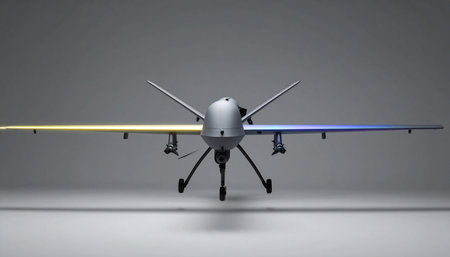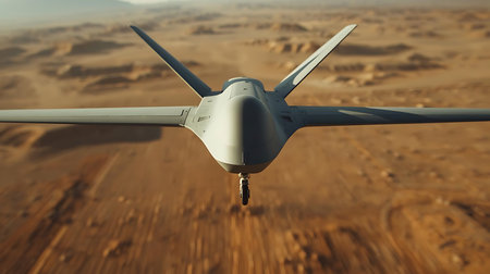 Military drone in flight. High-contrast, cinematic shot over desert. Dynamic and powerful. Ideal for defense, technology, war.