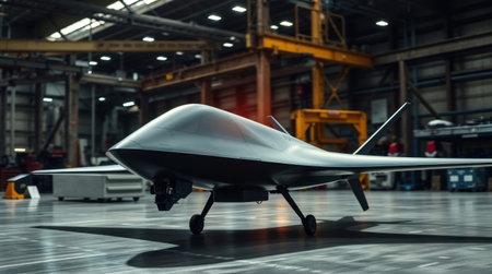 Close-up of a futuristic dark gray stealth drone with angular wings, positioned on a factory assembly line