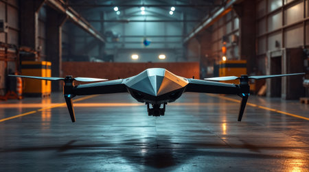 Drone in a hangar with futuristic digital interface and analytics screens. Blue light reflections on floor. Concept of artificial intelligence and aviation control.