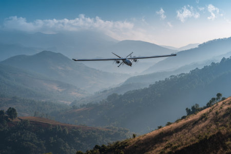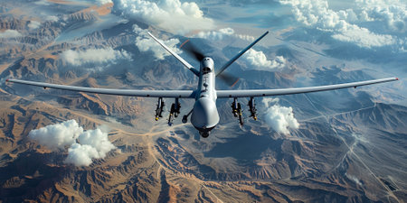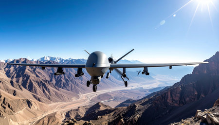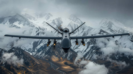 An advanced unmanned aerial vehicle UAV soars through a clear blue sky on a critical surveillance mission. Flying high above a vast, rugged mountain range, the armed drone represents the pinnacle of modern military technology, conducting reconnaissance and ensuring security in a remote, hostile environment.