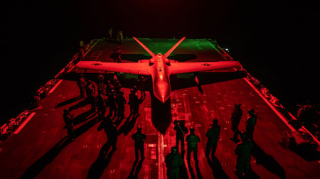 Military personnel working around an unmanned combat air vehicle - ucav - docked on the deck of an aircraft carrier at night