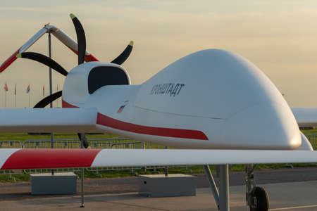 August 30, 2019. Zhukovsky, Russia.Russian multi-purpose heavy-class unmanned aerial vehicle (UAV) developed by company Kronstadt (AFK Sistema) at the International Aviation and Space Salon MAKS 2019.