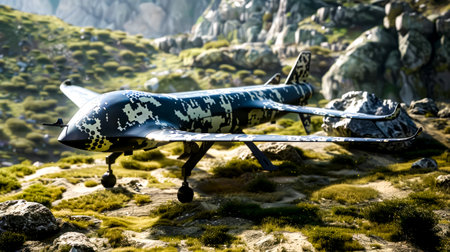 A military spy drone stands on the road waiting for takeoff. The image is for military, the weapon or spying backgrounds. View of a military drone spy ready for military action. 3D Rendering.