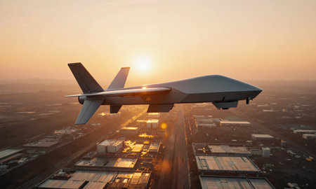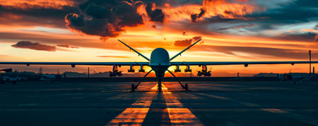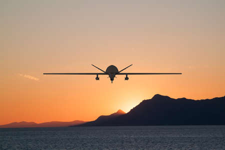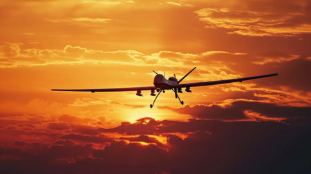 Fixed wing military drone flying in the air against the background of a hazy orange sunset