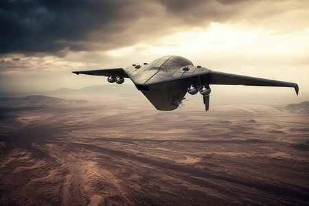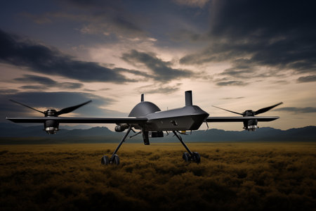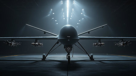 Reconnaissance military drone ready for flight standing in desert at night. Generative AI