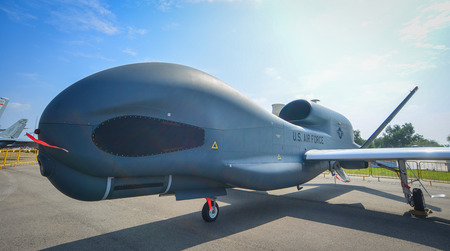 Singapore - Feb 10, 2018. A Northrop Grumman RQ-4 Global Hawk aircraft belong to the US Air Force on display at the 2018 Singapore Airshow.