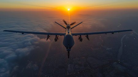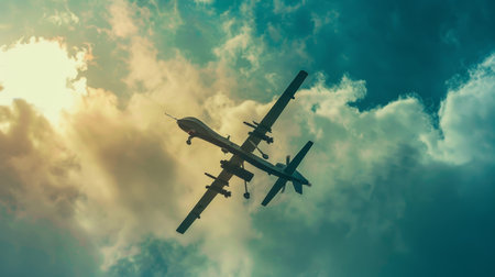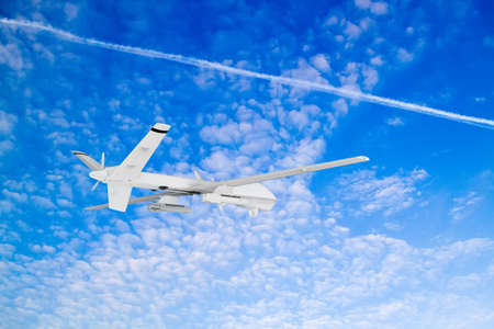 A military unmanned aerial vehicle UAV patrols flying over the clouds.