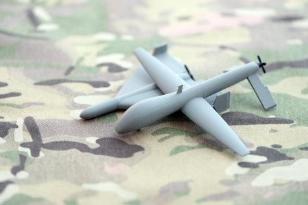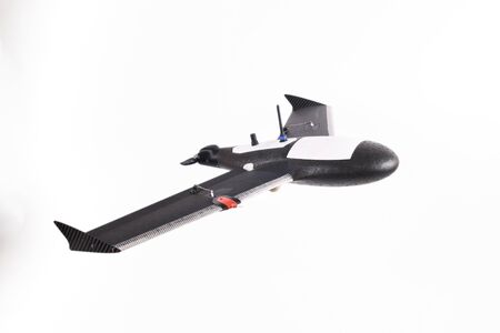 Military tactical drone kamikaze UAV, aerial view. Combat drone mission in a conflict area during Russia Ukraine military operation. Ukraine Russia war crisis, army drone attack, surveillance, spy