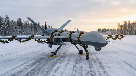 reconnaissance drone decorated with Christmas garland. Christmas at war