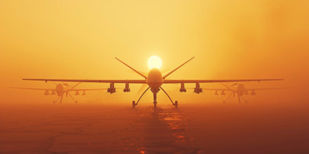 Cinematic military drone. Golden light, desert terrain. High-contrast photography. Power, dynamism and aerial technology.