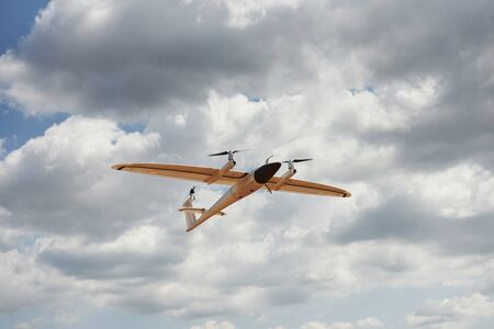An unmanned vehicle flies over the clouds control and tracking the sky over the territory