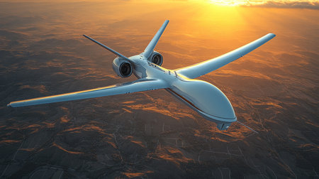 A sleek drone soars over hills and valleys beneath a stunning sunset sky.