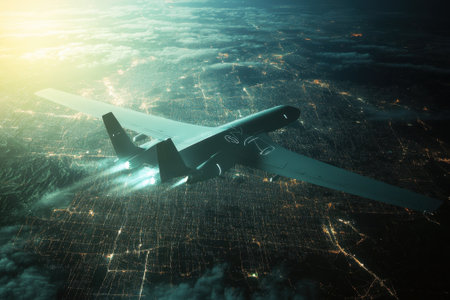 A sleek aircraft flies high above a brightly lit cityscape at night, illuminating the dark sky.