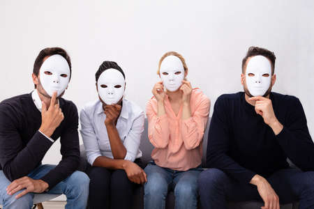 Group Of People Standing Together Covering His Face With White Masks