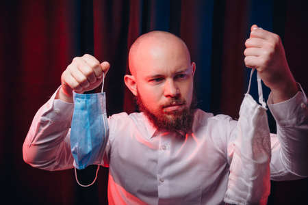 Frowned man in white shirt holding gauze masks in hands on dark background. Emotion of anger and determination. Healthcare, respiratory illness prevention, prophylaxis of virus infections, COVID-19 concept.