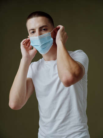 Photo young boyfriend in a medical mask in the hands of posing fashion light background unaltered