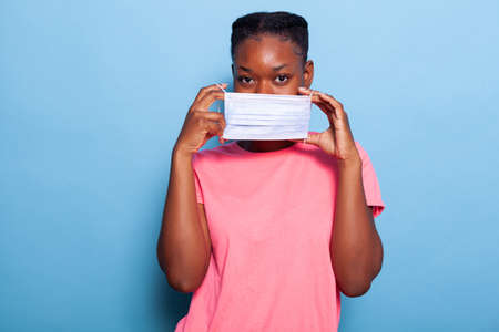 Portrait of african american student putting protective medical face mask to prevent infection with coronavirus during global pandemic. Woman standing in studio with blue background. Covid19 concept