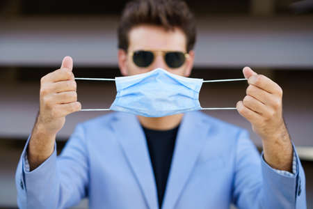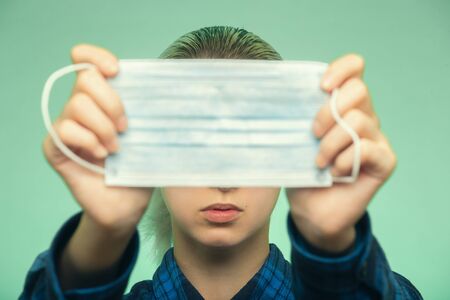 A young man holds a medical mask in his hands. Protection and Prevention COVID-19