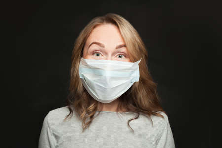 Portrait of casual woman in medical protective face mask on black background