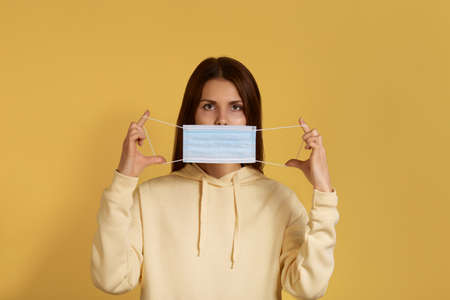 Indifferent calm young caucasian female in yellow hoodie holds medical mask in front of her, demonstrates how to put it on, comes to see doctor, has virus infection, isolated on yellow background