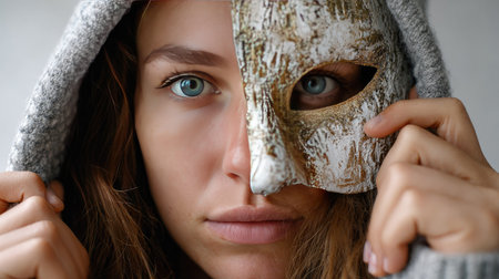 Hiding behind a mask, a young woman in a dark hoodie hides her face with a mask, self-identification problems and impostor syndrome. Portrait in the studio on a dark gray background.