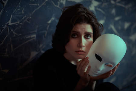 A sad brunette girl in black clothes sits by a grunge wall with a mask-role in her hands looking helplessly at the camera. Mental disorders. Human roles and hypocrisy.
