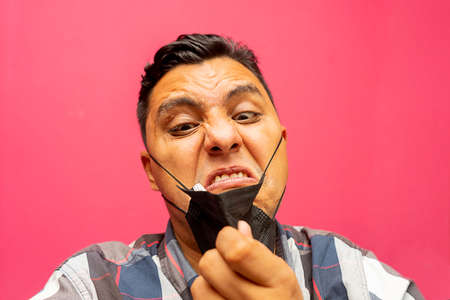 Isolated portrait of a man who is experiencing despair or signs of deteriorating mental health by ripping off the mask he wears due to the .