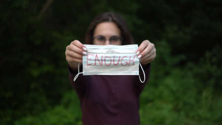 A young woman with glasses removes the medical mask with the inscription enough and holds it forward. Girl in the nature in a mask.