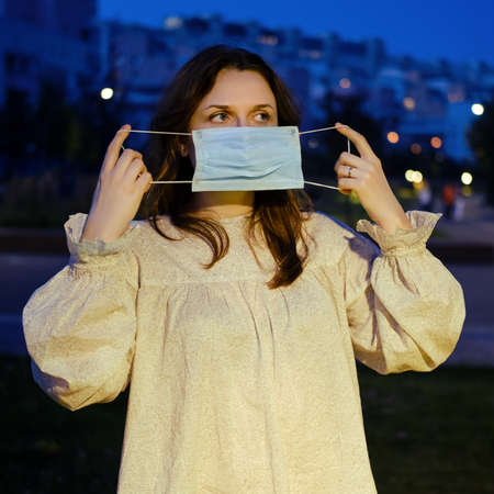 Young woman takes off her face mask on the night city street