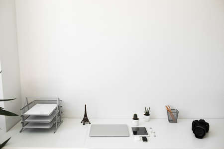Minimal office room with copy space and decorations on white wooden table and tree pot