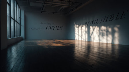 Bright sunlight streams through large windows, casting shadows and illuminating artistic text on the walls in a contemporary studio during the late afternoon.