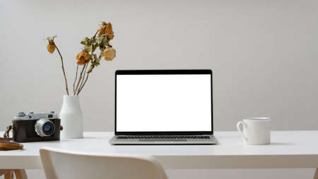 Close up view of modern simple workspace with blank screen laptop, camera, coffee up and dry roasts vase on white wooden table