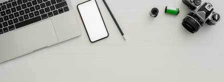 Overhead shot of comfortable workspace with blank screen smartphone, laptop, supplies and copy space on white desk