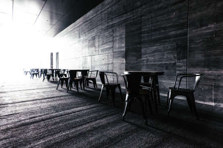 Angular shadows of metal chairs fall across a smooth grey floor, creating a dramatic contrast of shapes and lines in natural light.