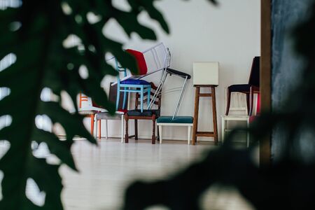 White plastic chairs stacked in a yard outdoor at a resort hotel for later use