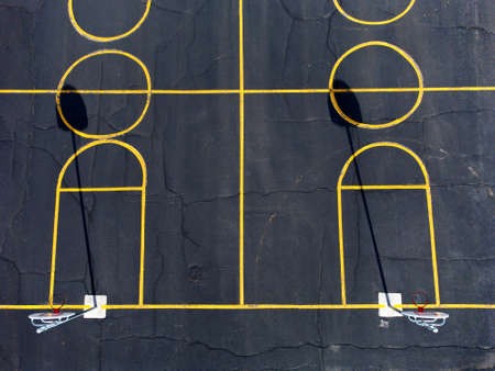 Aerial view from a drone flying above an outdoor urban basketball park with yellow lines and shadows