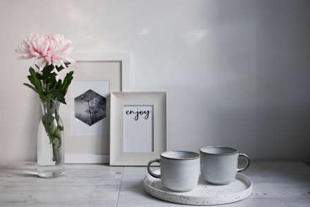 Scandinavian style. Interior Design. Large pink chrysanthemum in a long glass vase. Two cups of different size. Frame for photo. Empty space for text