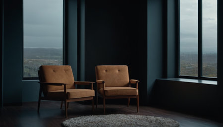 A row of sleek, black chairs is displayed in a waiting area, illuminated by soft natural light. The chairs' modern design is accentuated by the metallic legs and dark surface. The indoor setting, with blurred backgrounds, suggests a public space. This image can be used for conceptual illustrations or commercial projects.