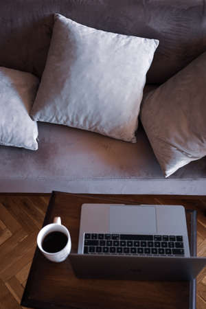 Close-up view of minimal workplace with laptop computer and copy space on with wooden table