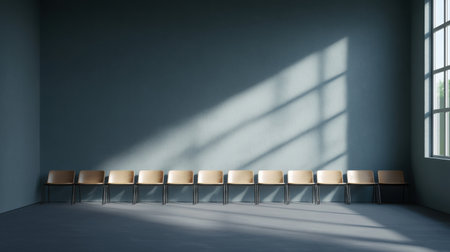 A serene minimalist interior features a line of wooden chairs bathed in natural light, emphasizing simplicity and tranquility in a bright space.