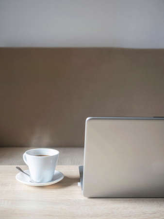 Simple office workspace with notebook laptop computer, notebooks, coffee cup and copy space. flat