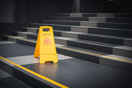 Caution wet floor sign on wet tiles floor at outdoor walkway