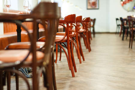 empty wooden chairs in coffee shop, blurred background, bokeh focus