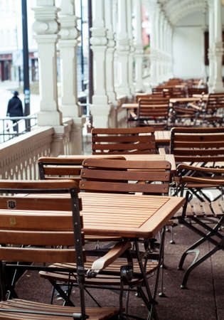 photo of wooden chairs and tables in one of Karlovy Vary's colonnades