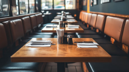 A Western food restaurant with empty booths, tables set with napkins and utensils, and no diners in sight. The scene is peaceful