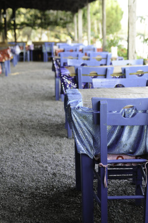 Athens, Greece. Greek traditional tavern empty tables and chairs outdoors at Plaka.