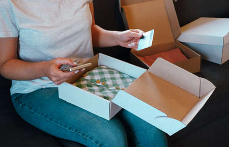 Online shopping. A woman examines a cardboard box with clothes from an online store. Blank business card place for text.