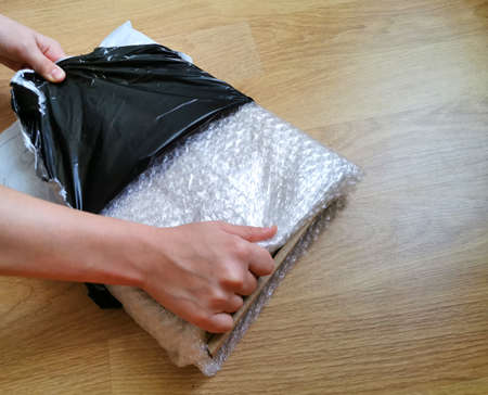 Plastic black bag covering the parcel out for protection product cracked or insurance during transit in brown carton box. Ecommerce shipment service concept