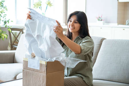 Smiling indian young woman buyer customer opening clothes parcel box at home.